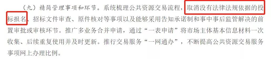 (九)精简管理事项和环节。系统梳理公共资源交易流程,取消没有法律法规依据的投标报名、招标文件审查、原件核对等事项以及能够采用告知承诺制和事中事后监管解决的前置审批或审核环节。推广多业务合并申请,通过“一表申请”将市场主体基本信息材料一次收集、后续重复使用并及时更新。推行交易服务“一网通办”,不断提高公共资源交易服务事项网上办理比例。