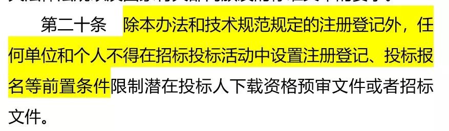 早在之前国家发改委和住建部等八部委公布第20号令《电子招标投标办法》中也明确规定:除本办法和技术规范规定的注册登记外,任何单位和个人不得在招标投标活动中设置注册登记、投标报名等前置条件限制潜在投标人下载资格预审文件或者招标文件。