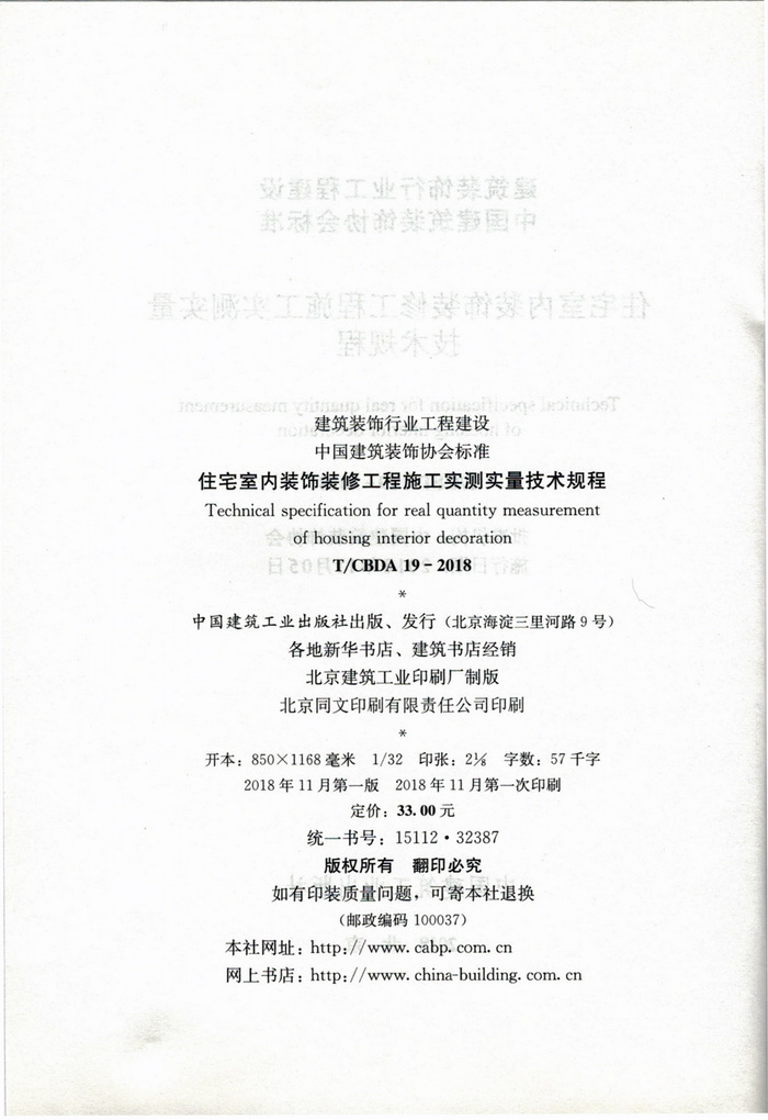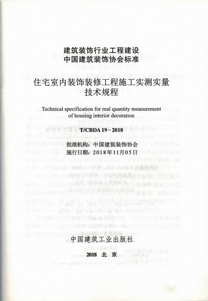 TCBDA 19-2018住宅室内装饰装修工程施工实测实量技术规程