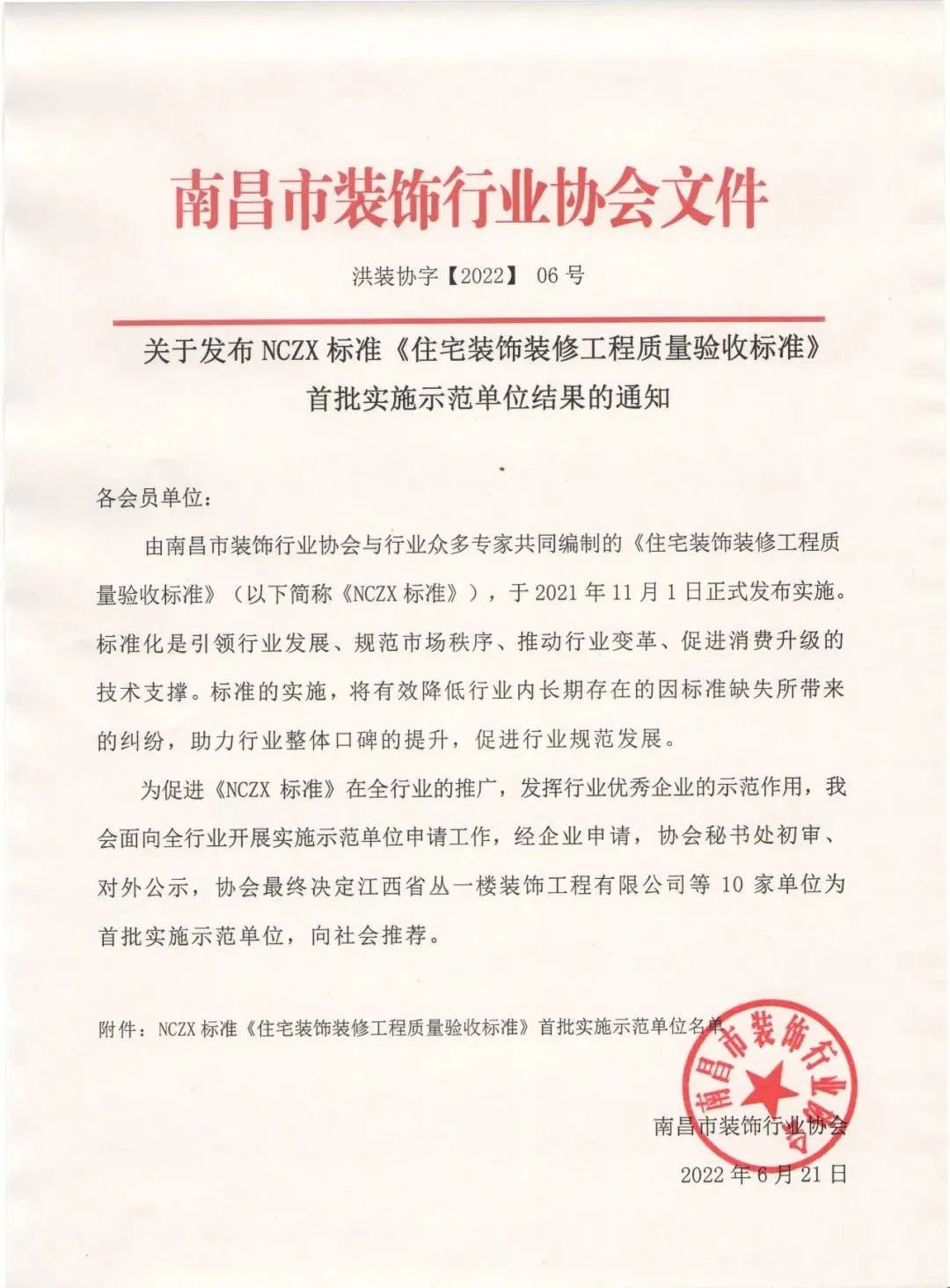 由南昌市装饰行业协会与行业众多专家共同编制的《住宅装饰装修工程质量验收标准》(以下简称《NCZX标准》),于2021年11月1日正式发布实施。为促进《NCZX标准》在全行业的推广,发挥行业优秀企业的示范作用,我会面向全行业开展实施示范单位申请工作,经企业申请、协会秘书处初审、对外公示,协会最终评定江西省丛一楼装饰工程有限公司等10家单位为首批实施示范单位,向社会推荐。